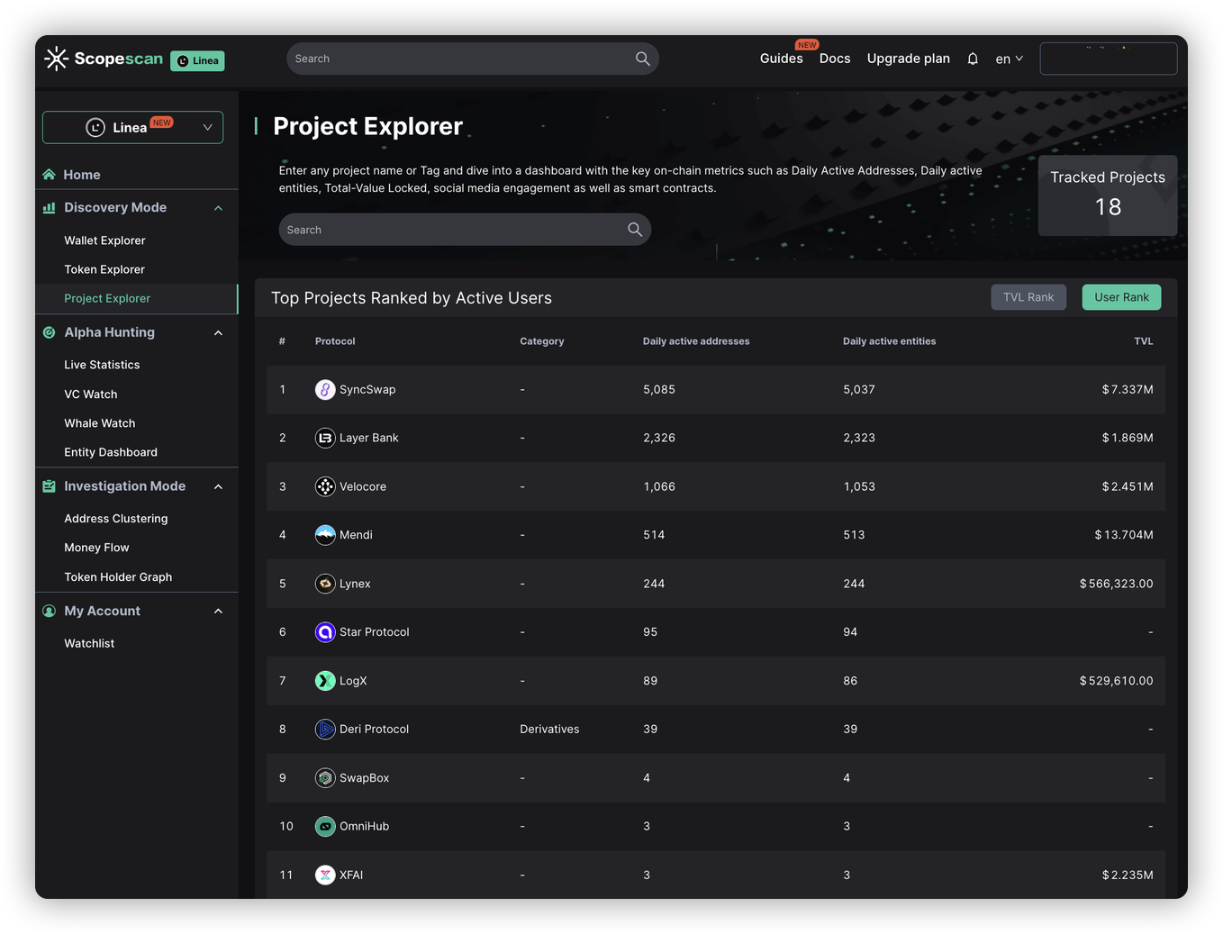 Scopescan is equipped with a variety of tools that help the Linea community better understand users, projects, and their interconnections. Here are the three categories through which Scopescan's lineup of tools are categorized: