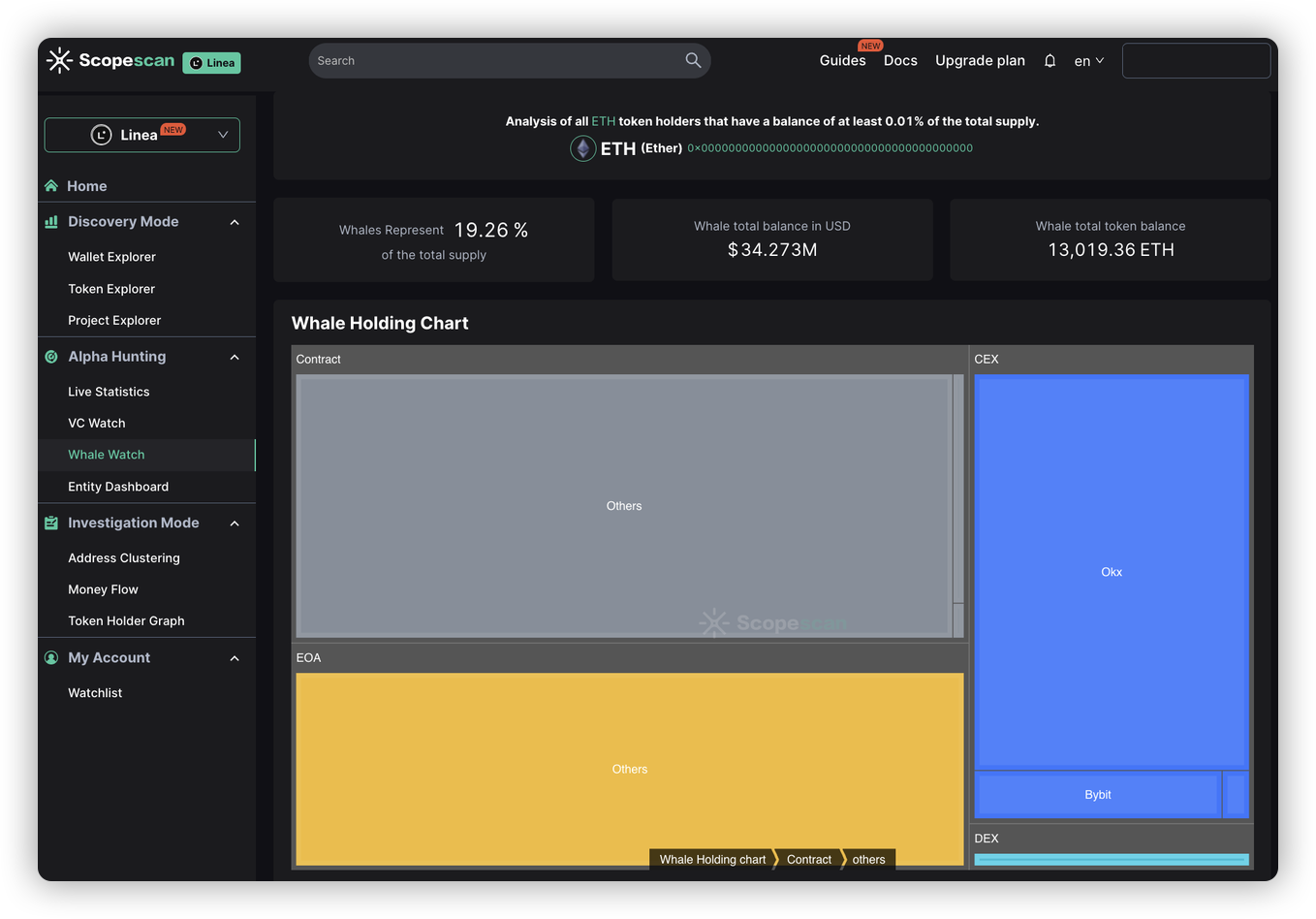 This segment of Scopescan contains dashboards focused on identifying potential alpha opportunities related to tokens and projects in the Linea ecosystem. The Live Statistics dashboard (shown in the first picture below) displays statistics such as active users, top gas spenders and consumers, and CEX activity on Linea-supported tokens. There are other dashboards dedicated to whales, VCs, and institutions affiliated with the Linea ecosystem. The second picture below is an example of the Whale Watch dashboard.